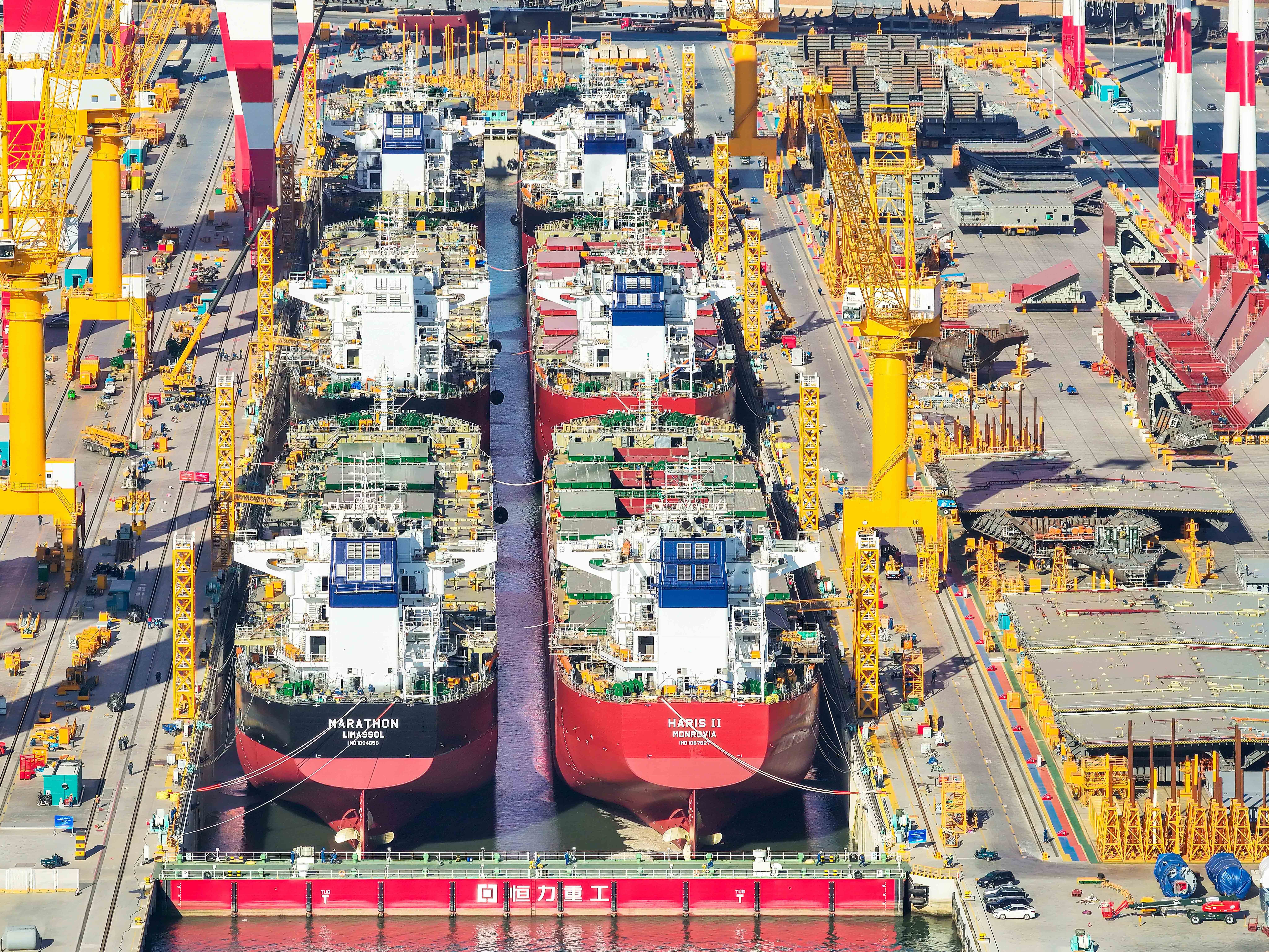 1月6日,由恒力重工3号船坞建造的6艘8.2万载重吨散货船同日出坞,该吨级散货船同坞建造、同日出坞,创造了全球造船行业“第一次”。此前4艘VLCC同坞齐出创造的纪录,恒力重工三天内两次创造全球造船行业纪录。